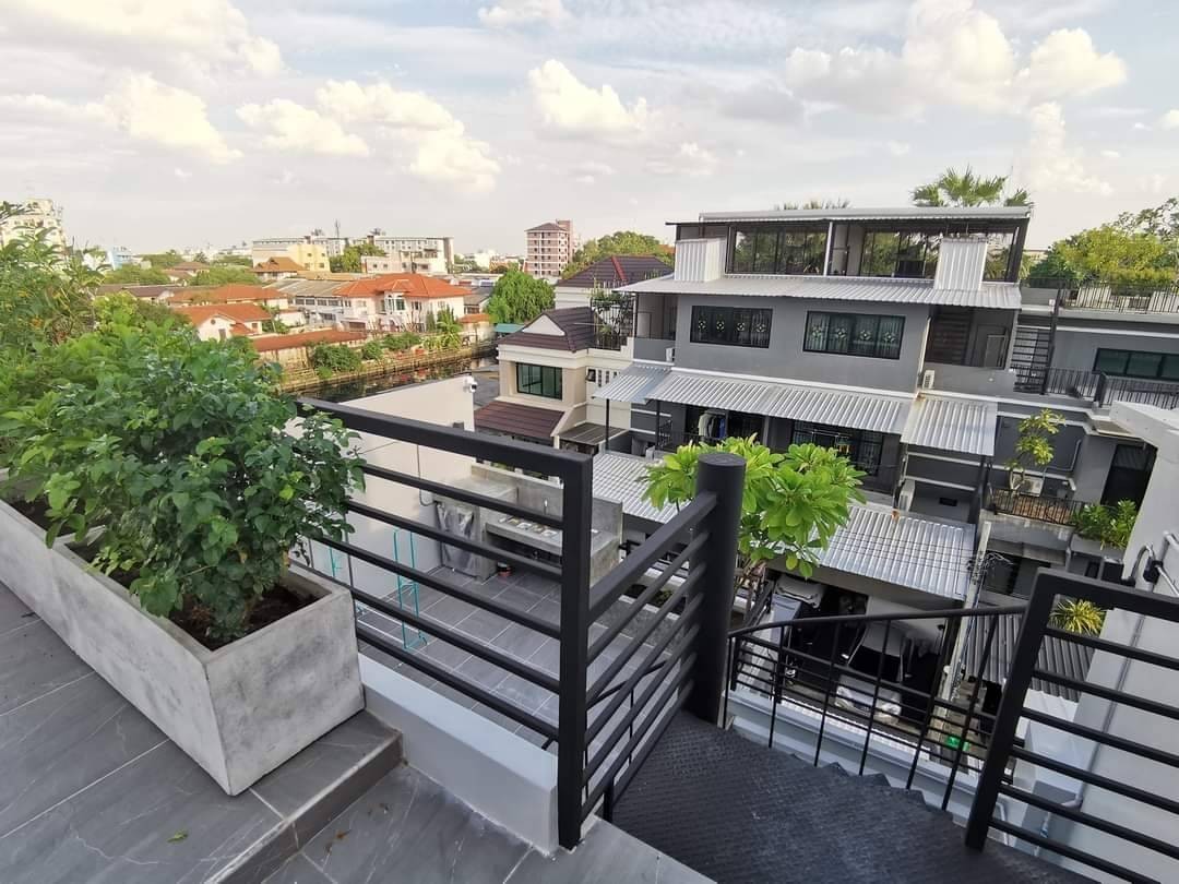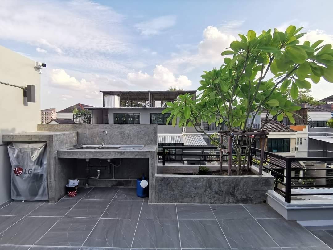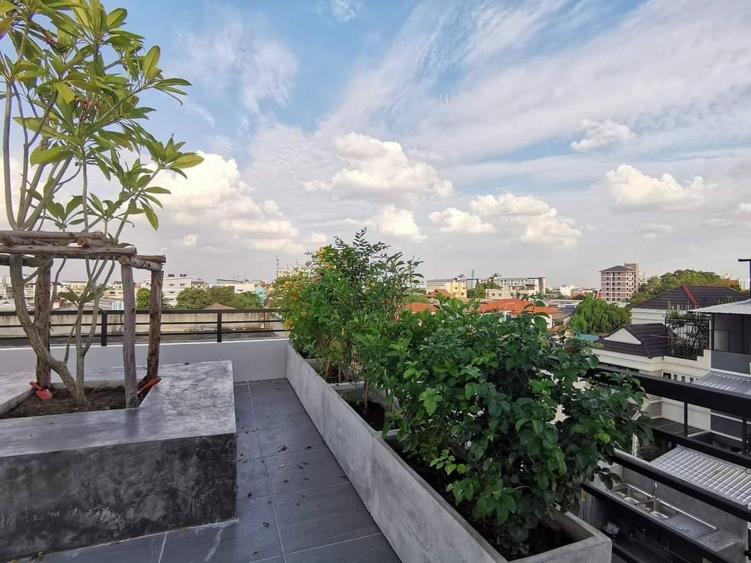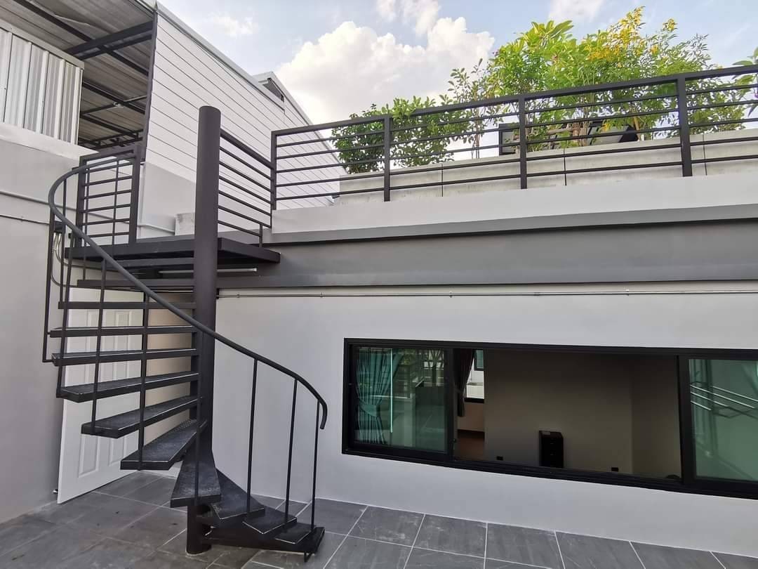 ส่วนของดาดฟ้า ปรับปรุงบันไดวนสีดำด้านให้เป็นตัวเชื่อมต่อส่วนดาดฟ้าเข้ากับระเบียงชั้น3 เมื่อเดินขึ้นไปก็จะพบลานกว้าง ที่เจ้าของบ้านปลูกต้นไม้เอาไว้ตามจุดต่างๆ เพื่อเพื่อความร่มรื่น และสามารถใช้เป็นพื้นที่ในการสังสรรค์