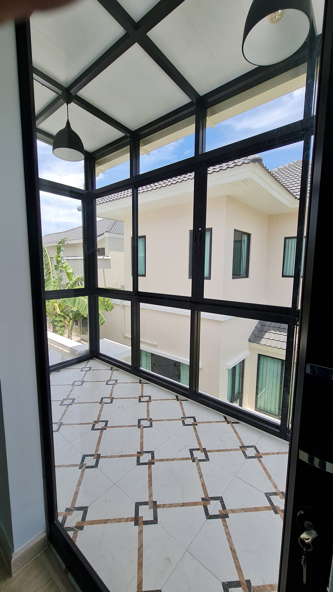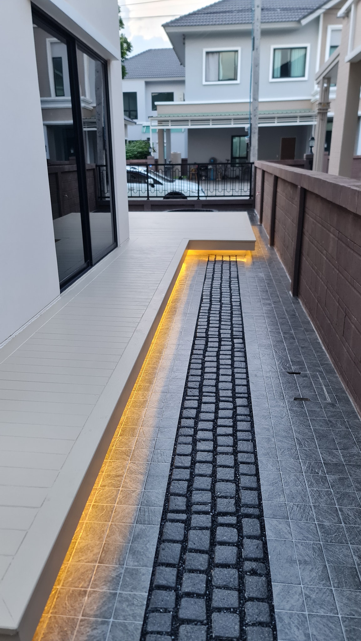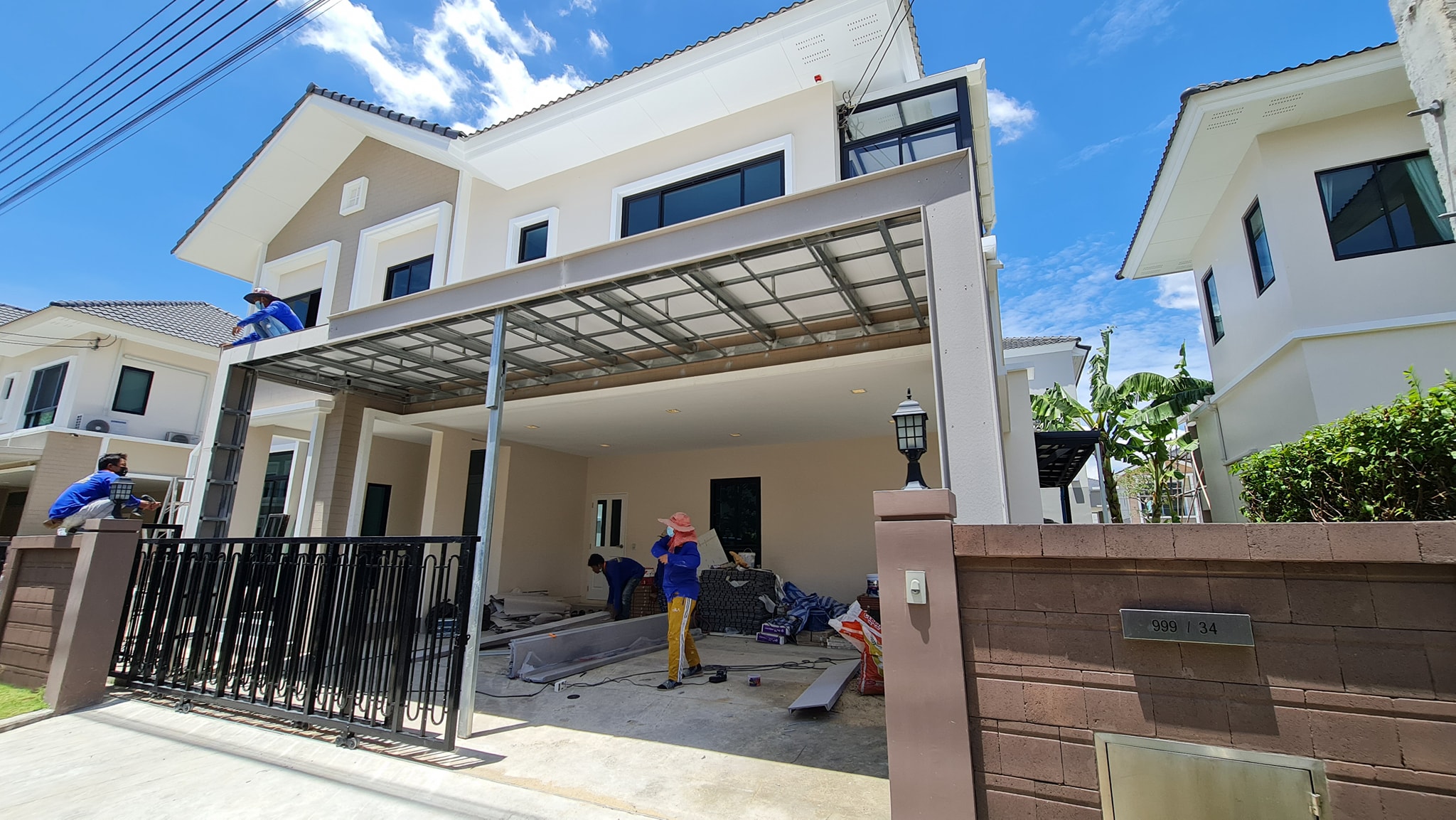 อีกหนึ่งผลงาน หมู่บ้านลัดดารมย์กาญจนาภิเษก งานรีโนเวทต่อเติมโครงเหล็กโครงหลังคาโรงจอดรถหน้าบ้านหลังบ้าน งานตกแต่ง ทางเดินและระแนงไม้พื้นคอนวูดซ่อนไฟ งานปูกระเบื้องตกแต่งภายในต่อเติมห้องกระจก Glass House