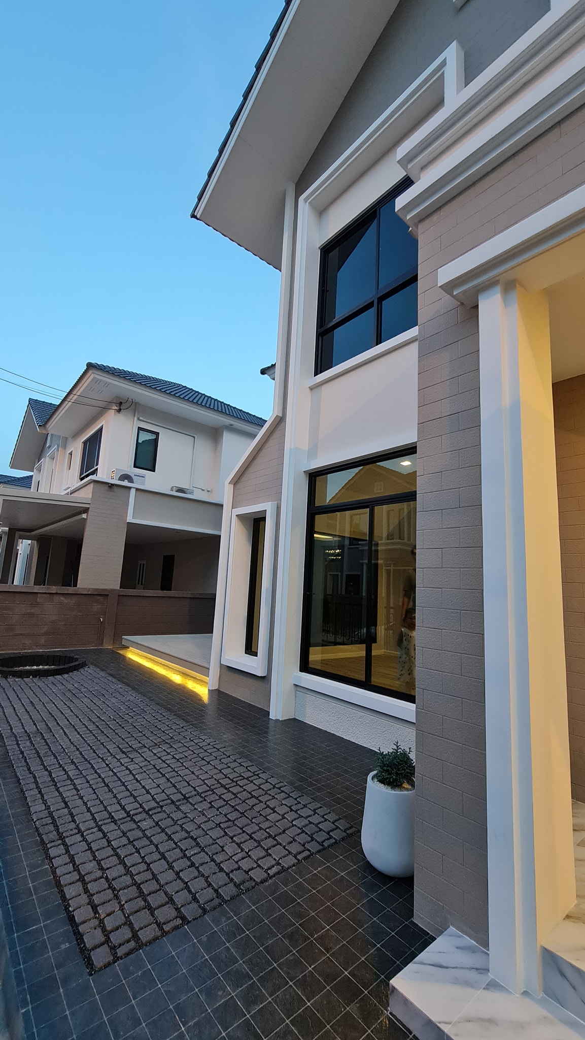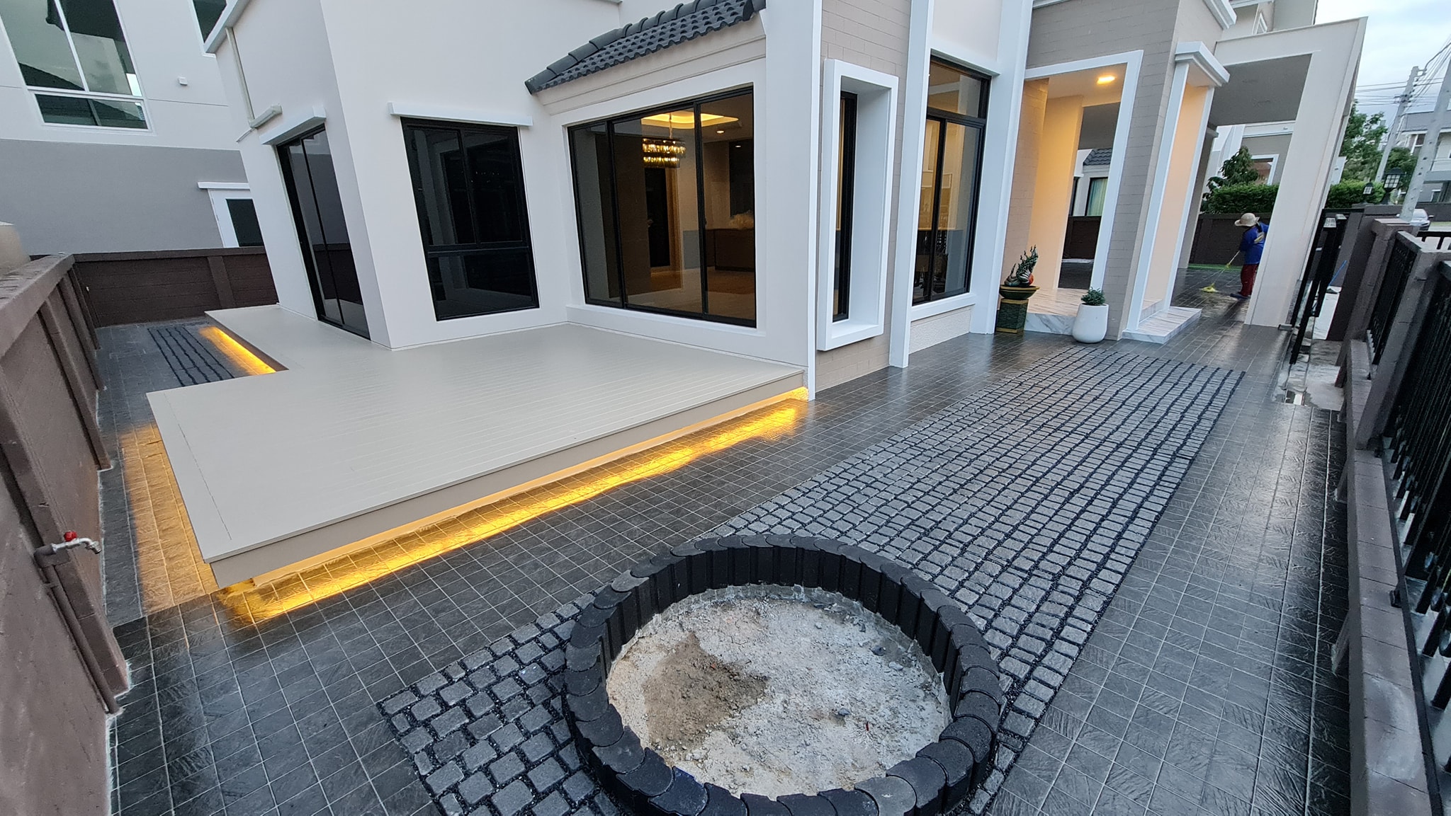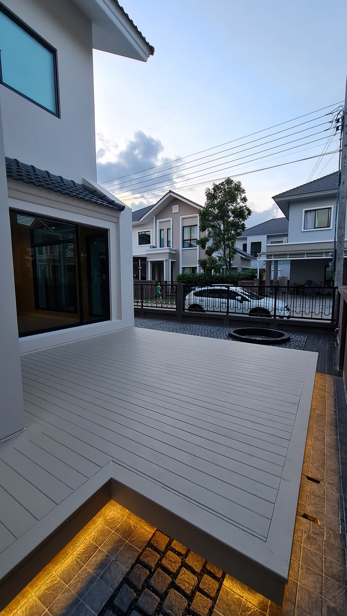 อีกหนึ่งผลงาน หมู่บ้านลัดดารมย์กาญจนาภิเษก งานรีโนเวทต่อเติมโครงเหล็กโครงหลังคาโรงจอดรถหน้าบ้านหลังบ้าน งานตกแต่ง ทางเดินและระแนงไม้พื้นคอนวูดซ่อนไฟ งานปูกระเบื้องตกแต่งภายในต่อเติมห้องกระจก Glass House